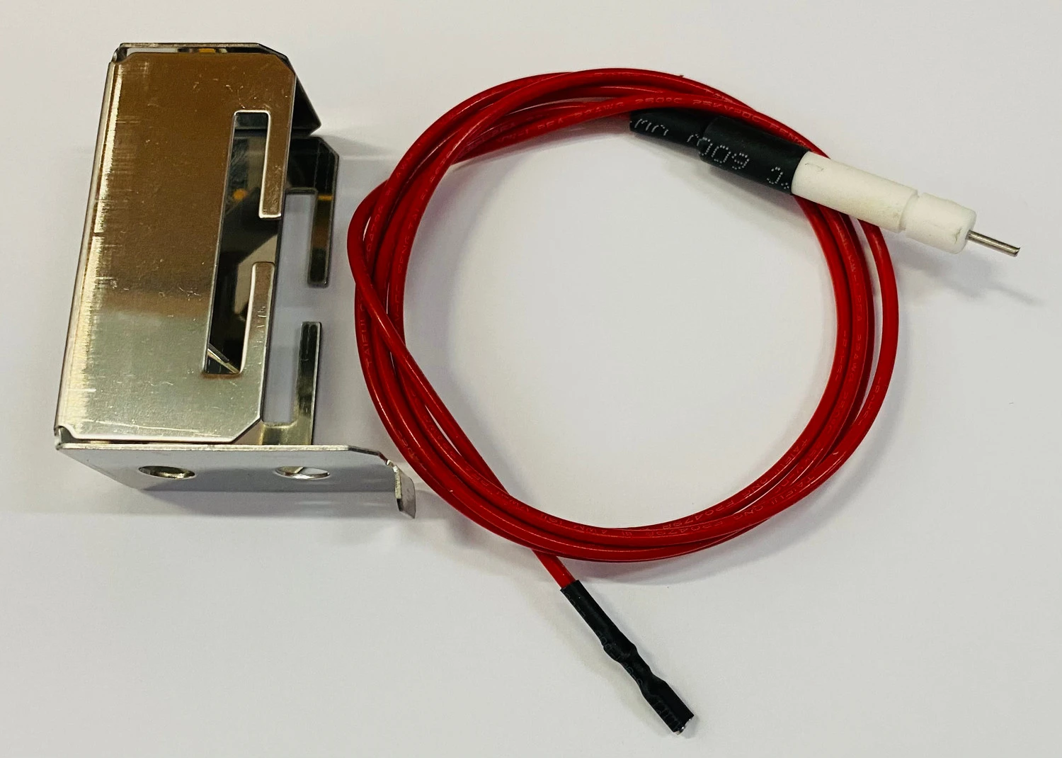 This aftermarket DCS U Burner electrode, collector box and extra long 41″ wire has a flat female spade gets plugged into a 9 volt spark generator. This electrode would be used for 48″ grills needing extra long wires to reach the furthest burners..