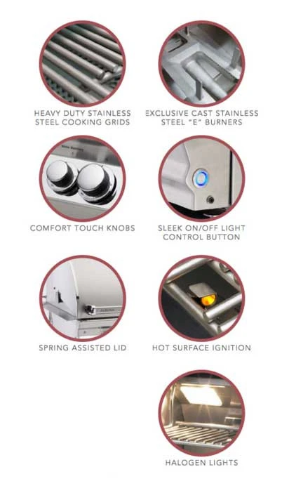 This grill features sleek styling with seamless control panel double-walled tear-drop hood with warming rack, stainless rod cooking grids, 3 main burners producing 75000 BTUs and 660 square inches of cooking surface (30 x 22 main grilling area).