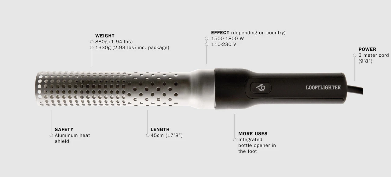 LOOFTLIGHTER, quick, safe, and eco-friendly;Â no flame, no gas, no lighter fluid.