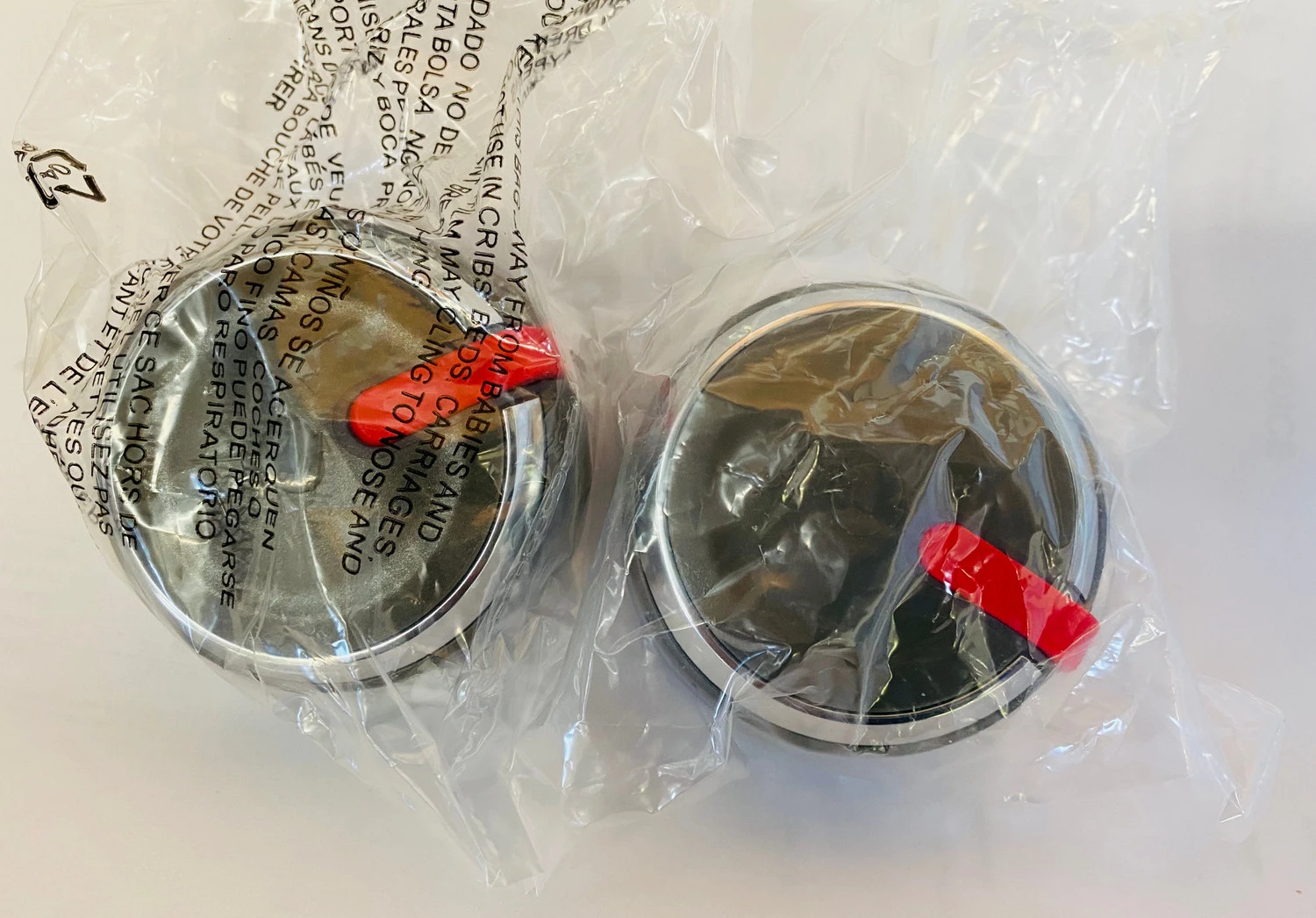 This Weber knob has a gray plastic body with a chrome trim it also has a translucent rim for emitting light and a red position indicator. Â